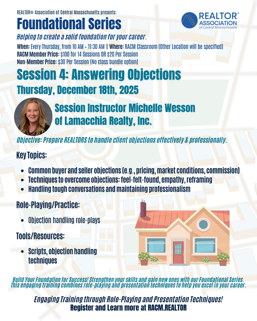 Weekly Series Foundational Series – Helping to create a solid foundation for your career. Thursday of each week from 10 am – 11:30 am Hands-on Training with Role Playing and Presentation techniques Topics